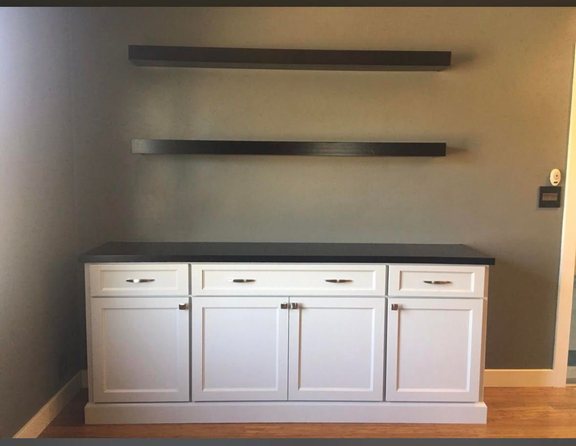 A room with white cabinets and black shelves