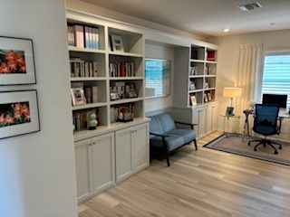 A hallway with white cabinets and wooden shelves